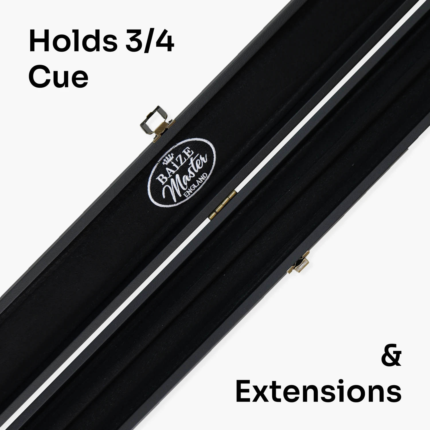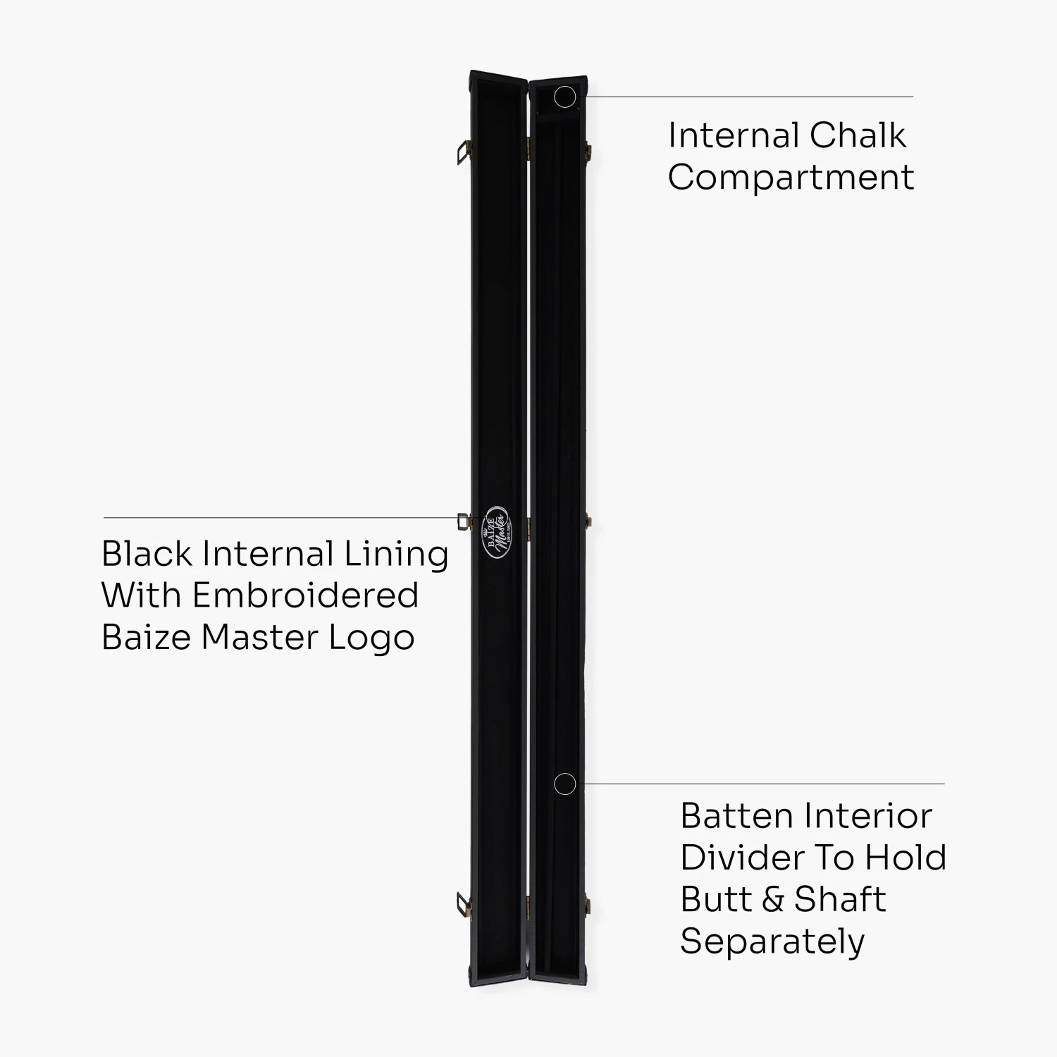 Our deluxe Baize Master 3/4 cue cases feature chunky plastic ends for improved protection mixed with a clean and simple black leatherette design. Combined with an internal chalk compartment and suede style padded interior, it will hold the cue tightly in place – this case offers the perfect blend of stylish looks and practical function. Finished with a quality exterior Baize Master metal badge and internal Baize Master embroidered logo.