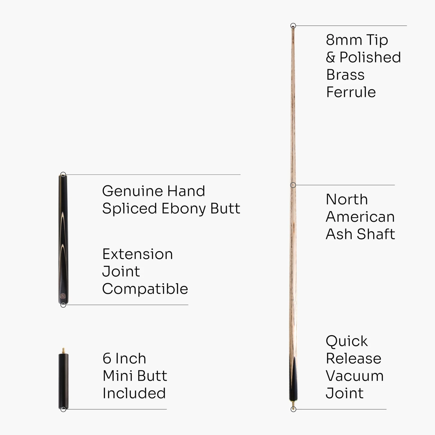 - 57 inch (145cm) cue with a ¾ joint – great feel for the shot and convenience in transport