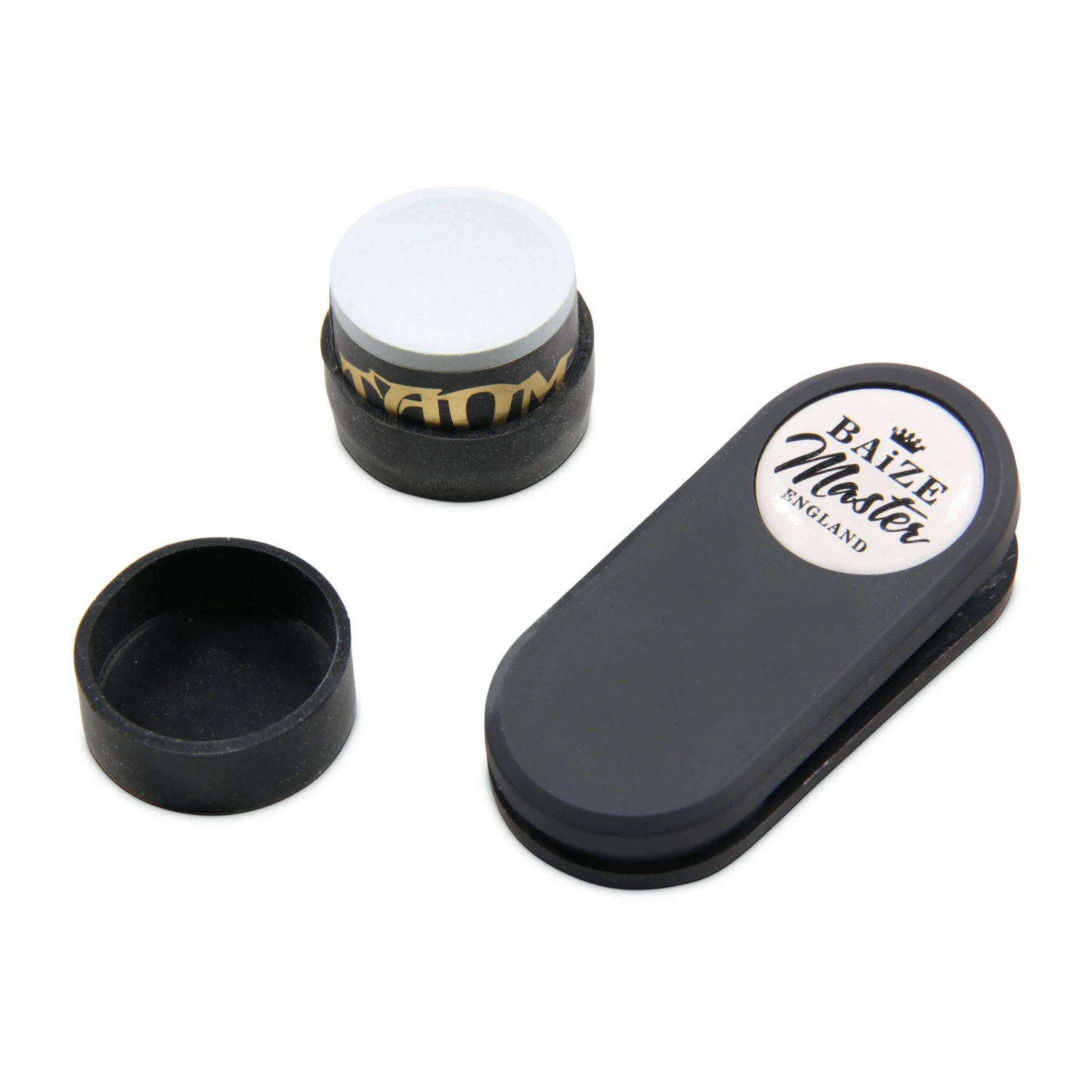 This ingenious, high quality Baize Master chalk holder can hold both round Taom style chalks and the traditional square style chalk. With a strong magnetic action, the chalk stays secure on the pocket clip until needed. The holder can be reused many times, as the magnet sits in the bottom of the tight rubber chalk holder, as does not use glue, allowing chalks to be easily changed.