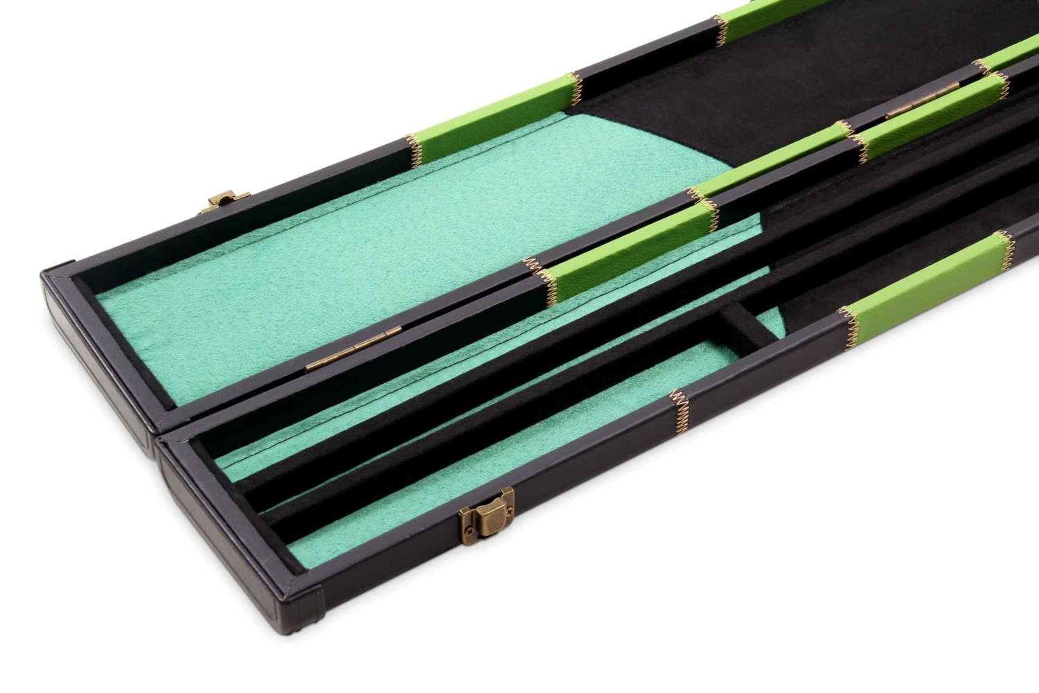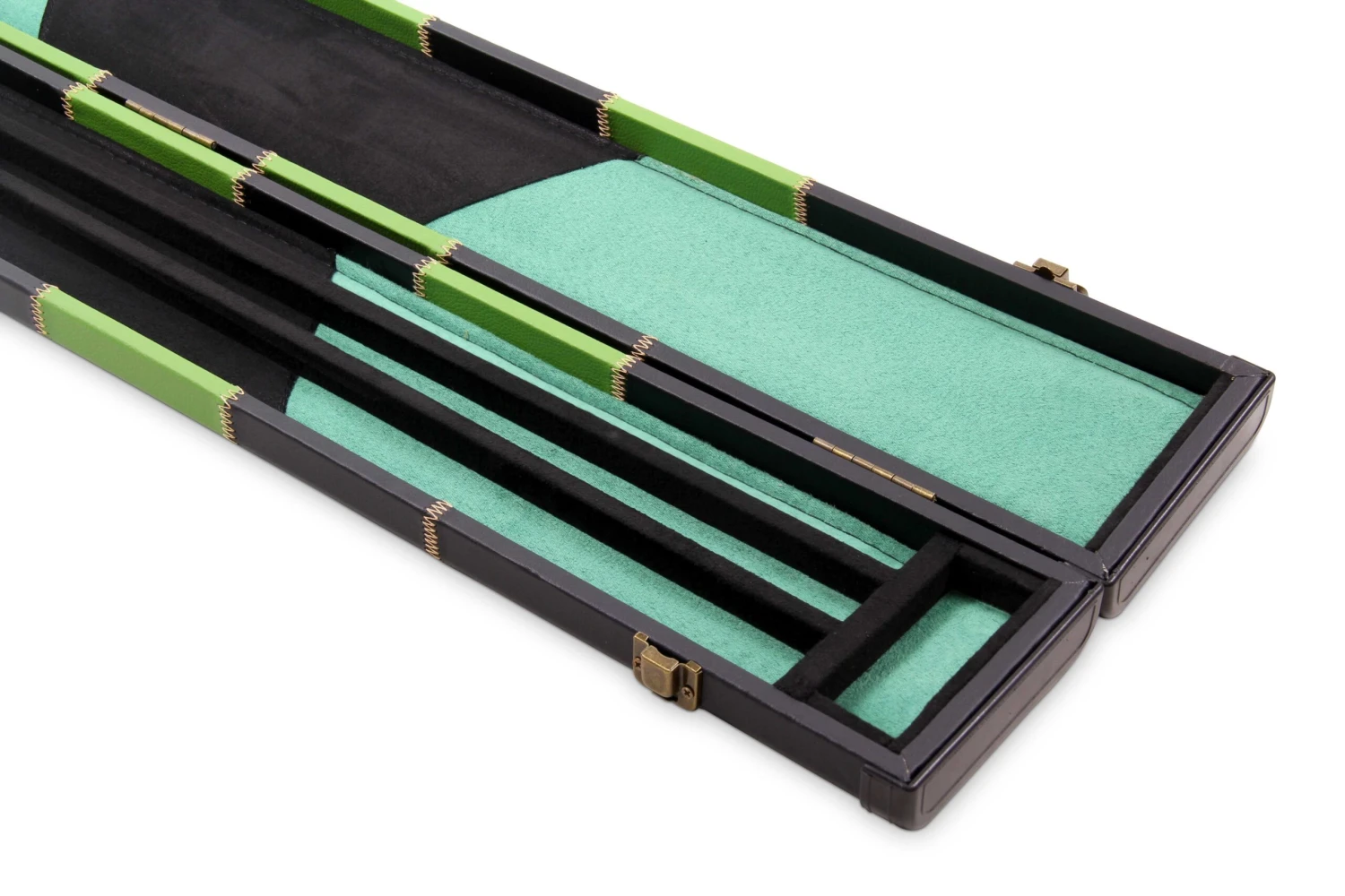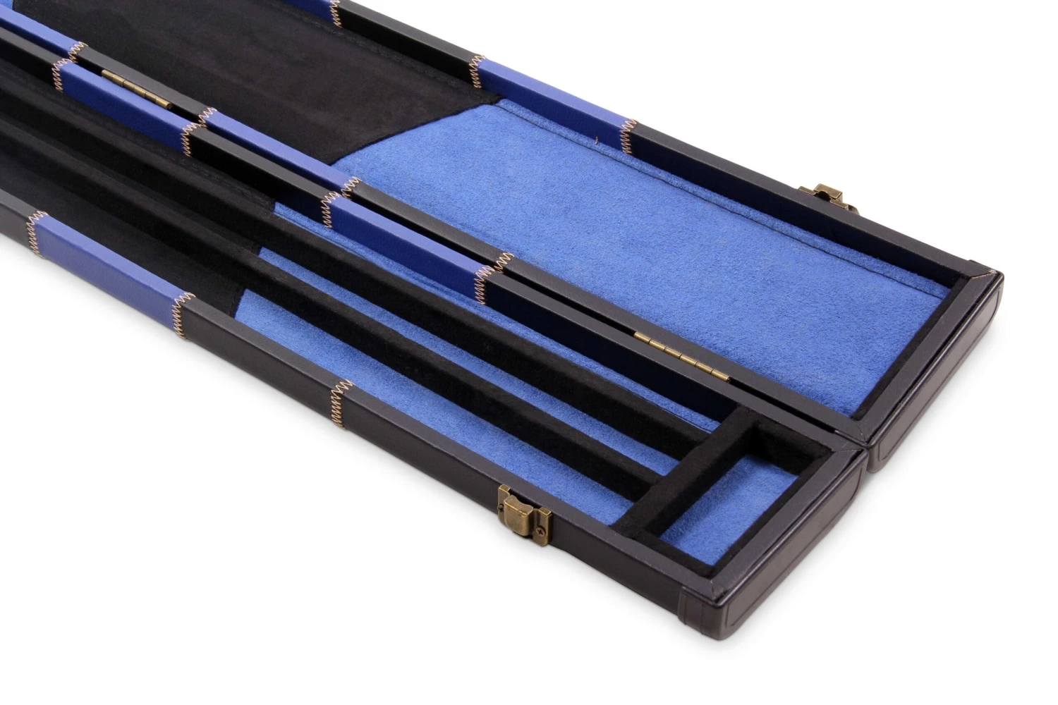 These 3 Slot deluxe cue cases are designed to hold a centre joint cue, telescopic extension, mini butt and chalks. They feature chunky plastic ends for improved protection mixed with an eye-catching chequered patch design for an overall, highly desirable cue case. Combined with an internal chalk compartment and matching colours suede style padded interior – this case offers the perfect blend of stylish looks and practical function.