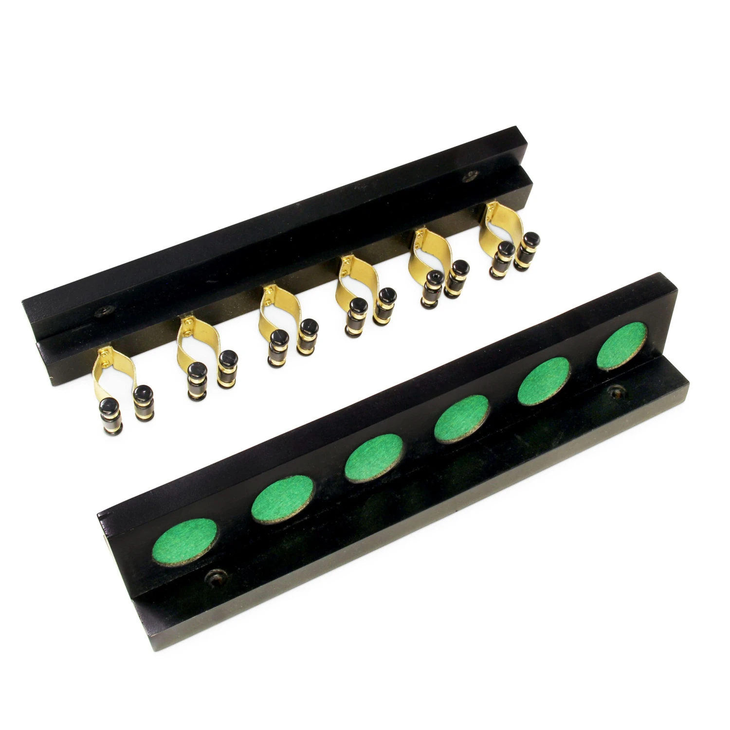 These wall mounted cue racks hold up to 6 cues with easy clip in clip out function. They have two sections, the lower has indented domes for the butt of the cue with the top housing the brass clips to keep cues securely in place. They come complete with screws and wall plugs.