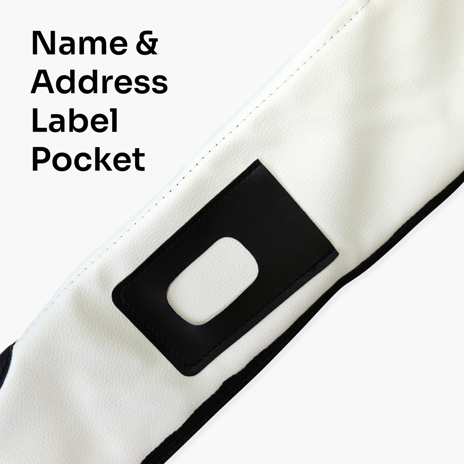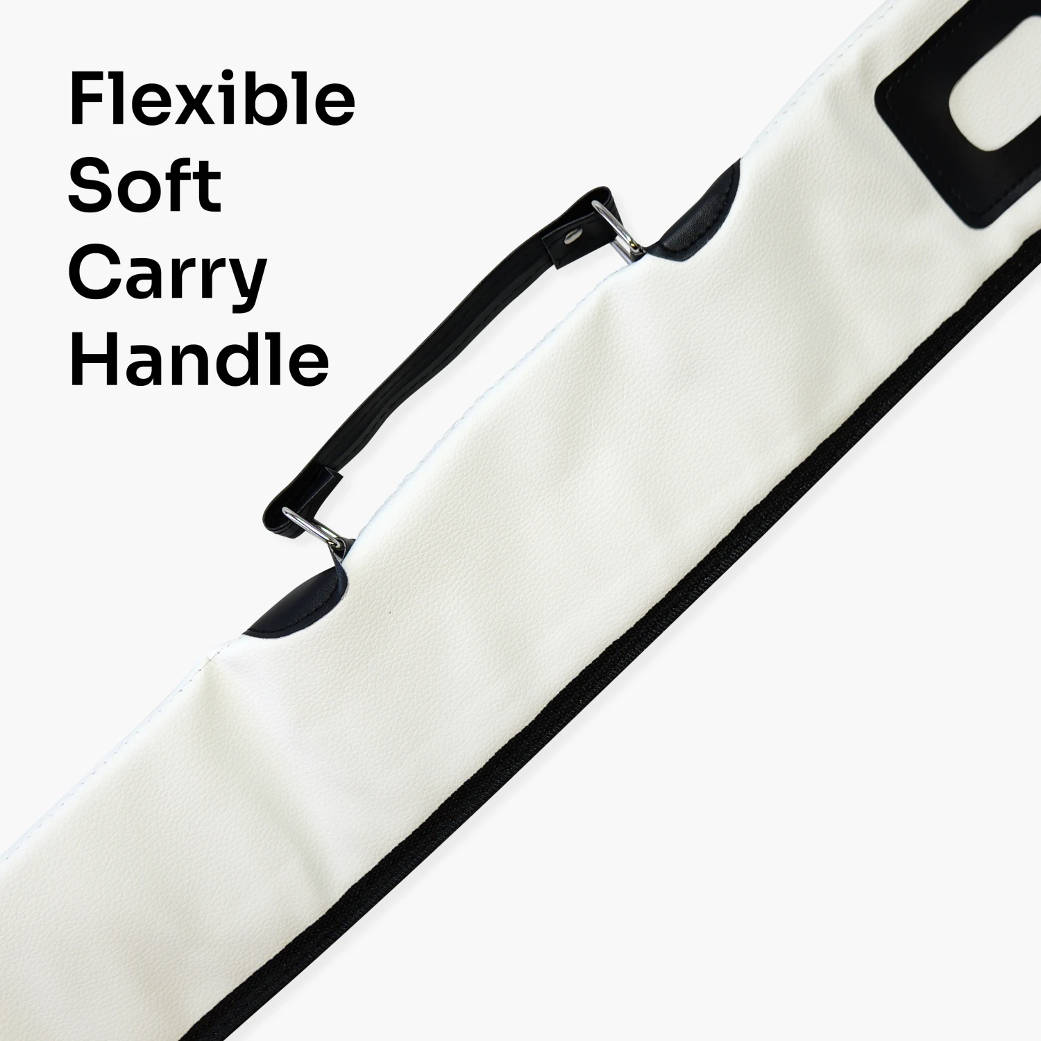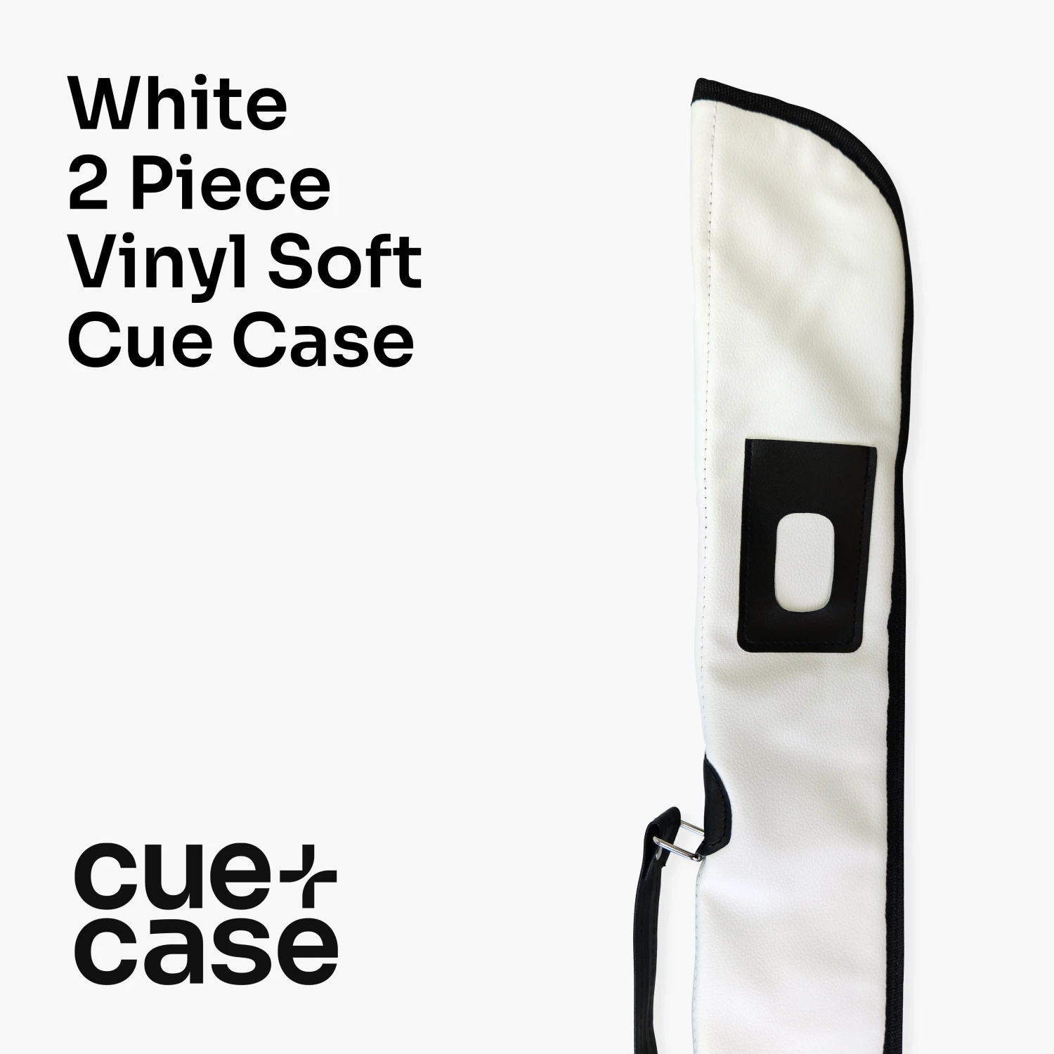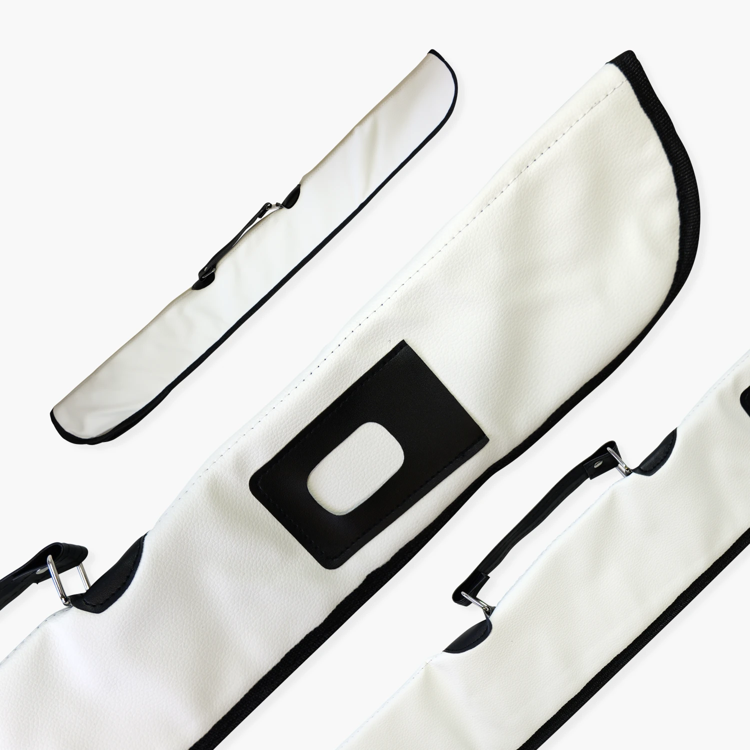 A white vinyl soft cue case with padding designed to protect the cue and provide a suitable carrying solution
