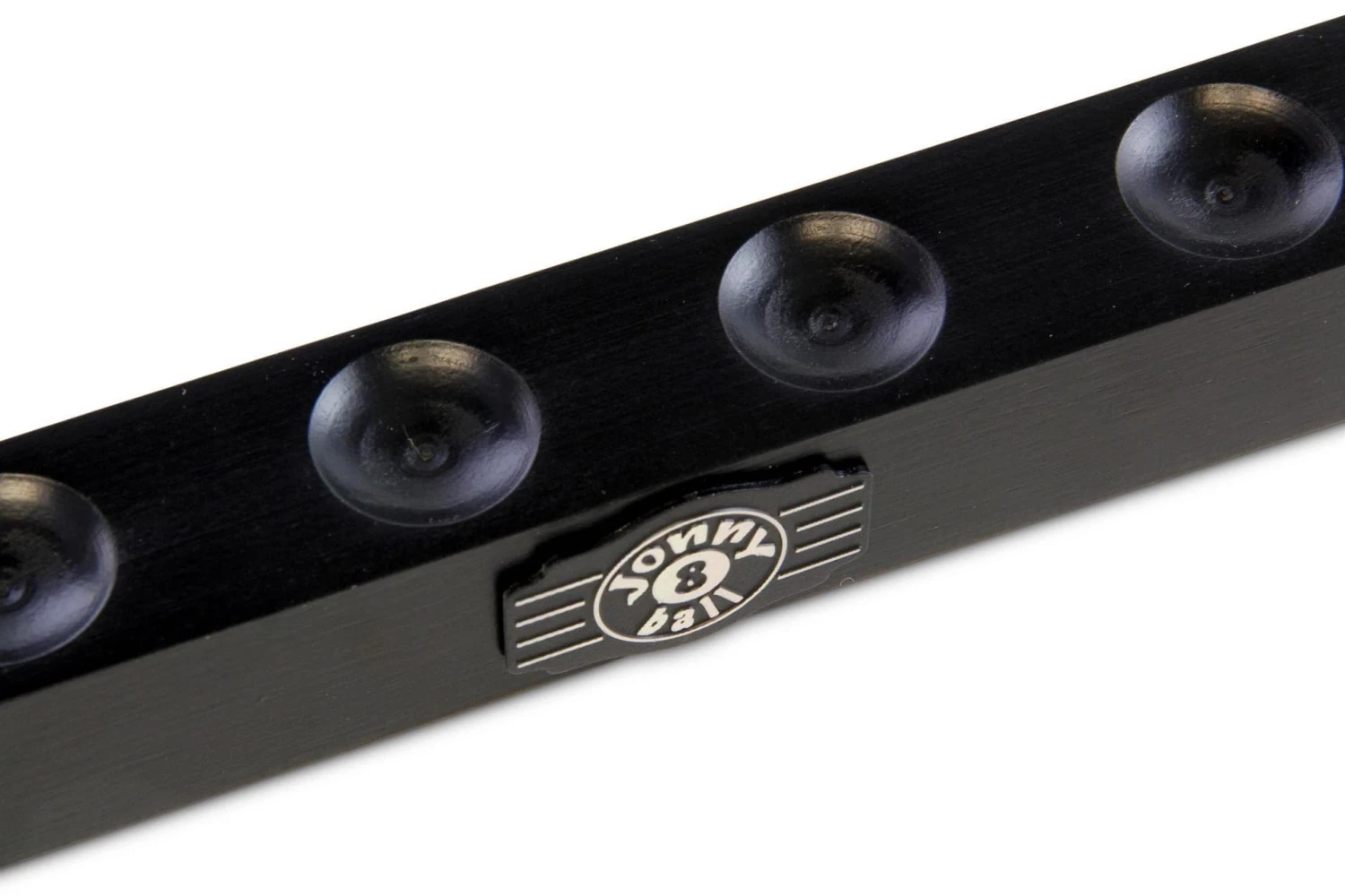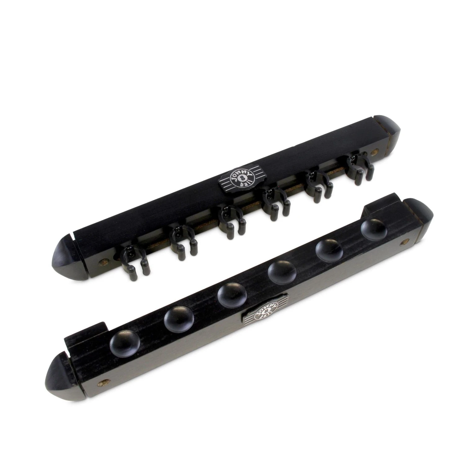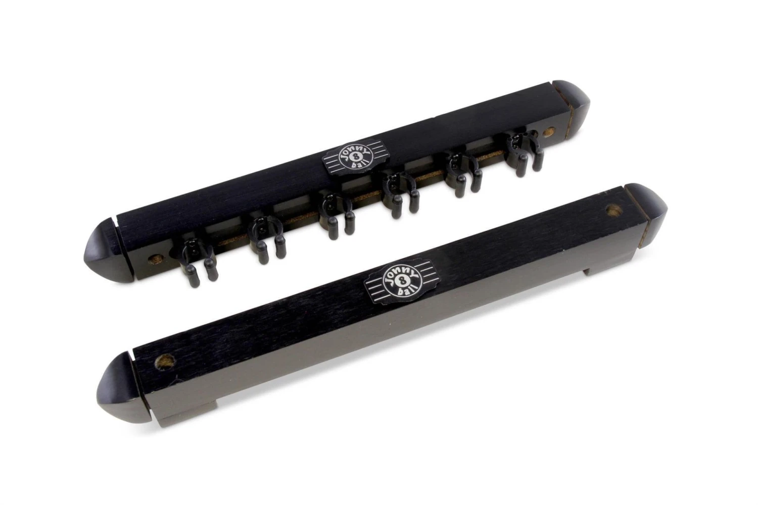 These Jonny 8 Ball wall mounted cue racks hold up to 6 cues with easy clip in clip out function. They have two sections, the lower has indented domes for the butt of the cue with the top housing the plastic clips to keep cues securely in place. They come complete with screws and wall plugs.
