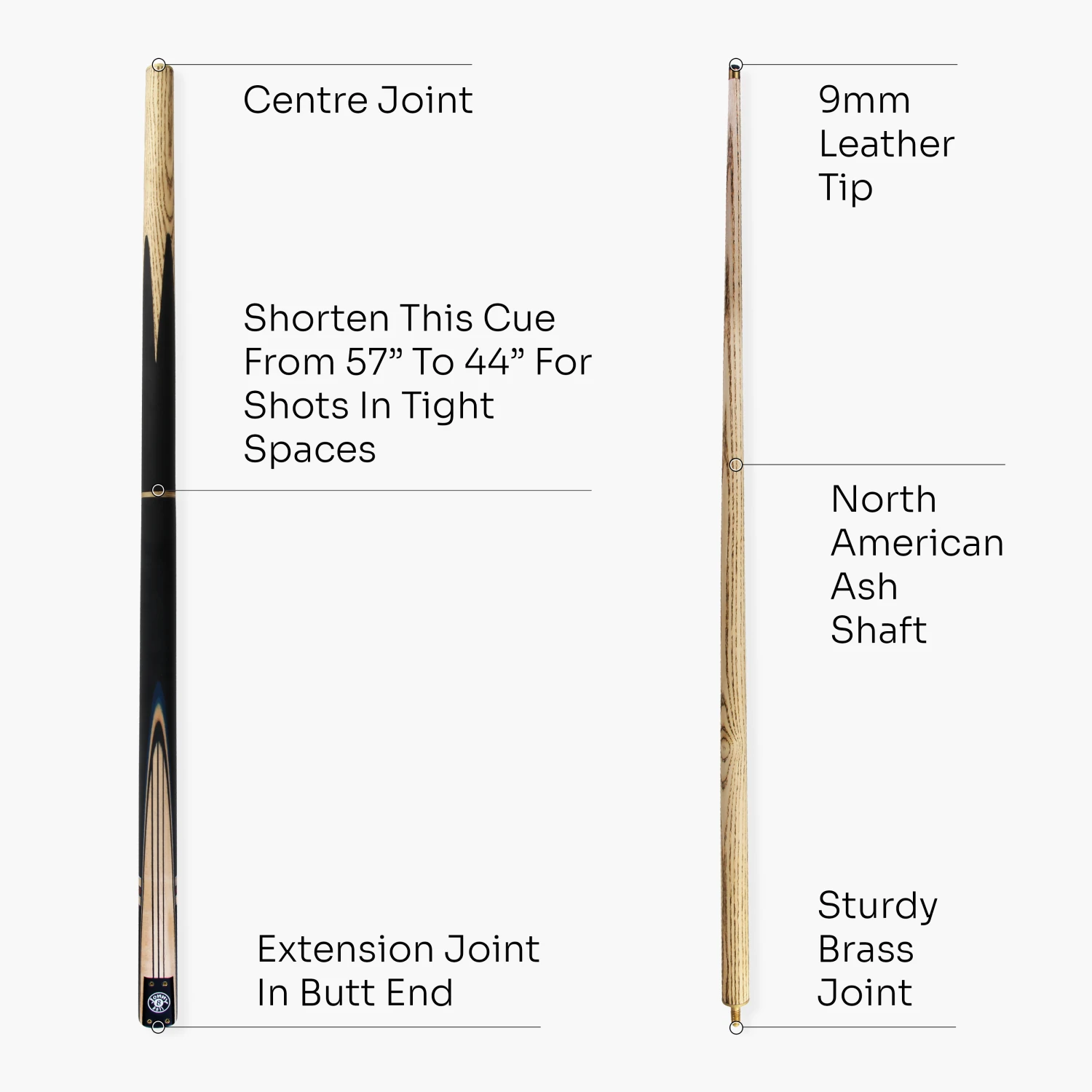 - Easily shorten this cue from 57” to 44” for taking shots in tight spaces