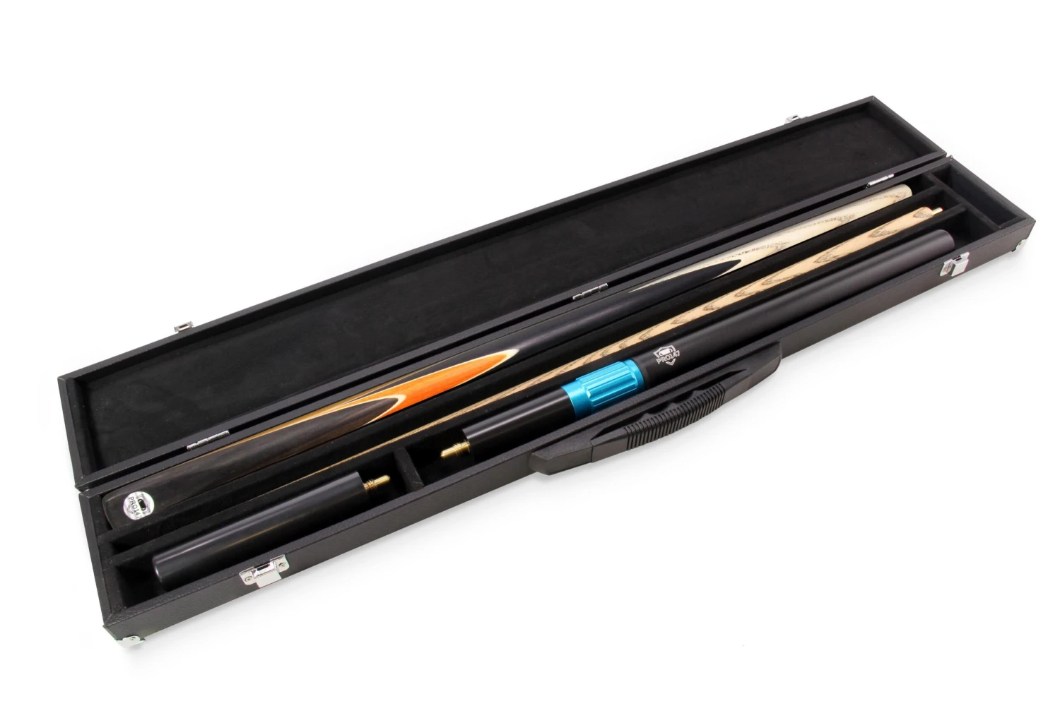 The CRUCIBLE range of cues from PRO147 are manufactured to high standards using modern innovative methods. The butt is hand spliced from a premium synthetic ebony wood with diamond wood splices, giving a quality feel with a superb look, whilst keeping the price affordable. Ebony is a rare and very expensive wood, making this type of cue more sustainable without compromising on the playability or aesthetics. With its silky-smooth, machine polished shaft and conditioned pro leather tip, this cue is supplied ready for action and is a true pleasure to play with. The all-in-one cue and case set includes matching long telescopic screw in extension, mini butt and 3 slot hard case to neatly house the whole set.