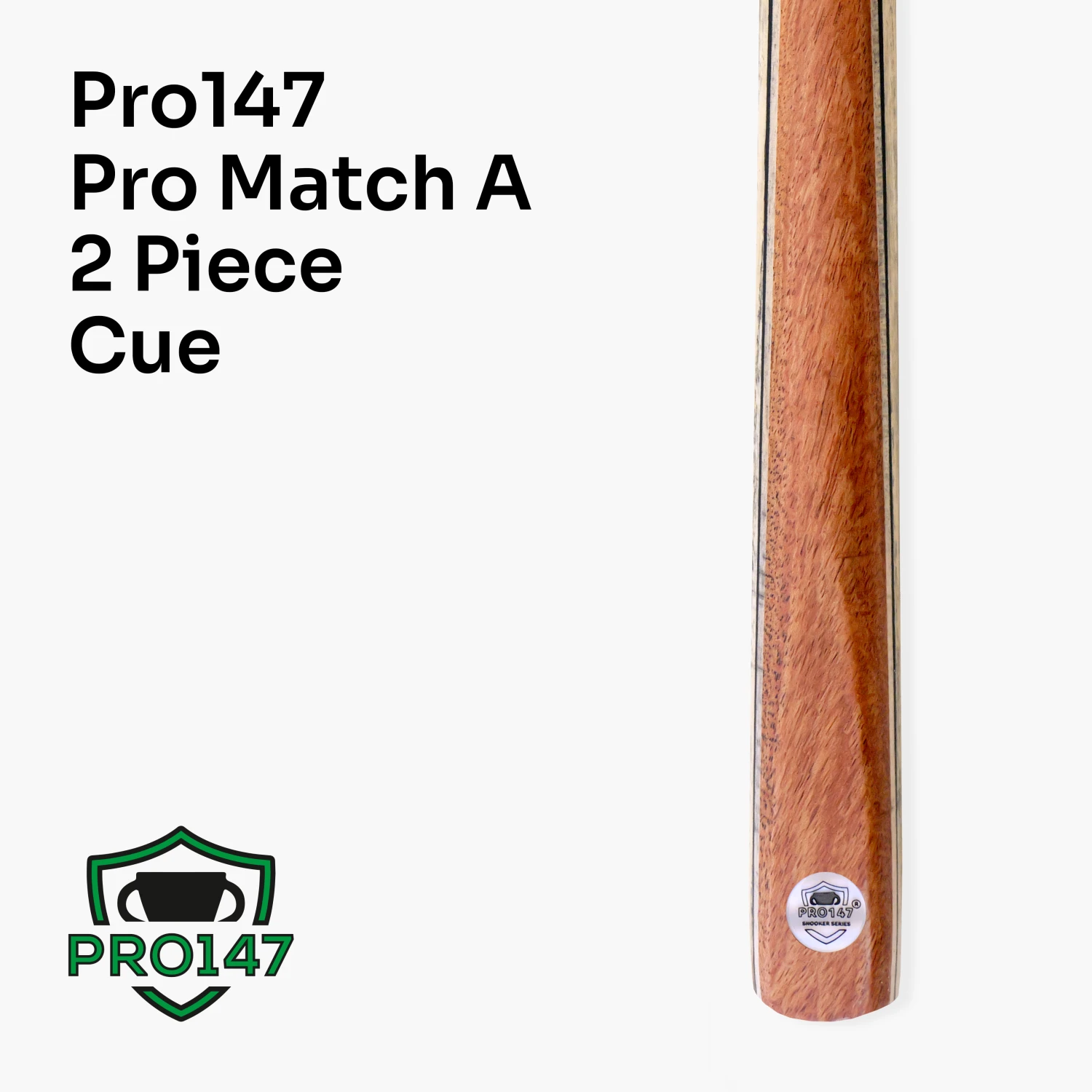 The PRO147 Pro Match Series of cues have a distinctive design featuring a fully ash shaft and butt. A matching ash grain leads down from the shaft to a single faced splicing with a coloured decal and a maple veneer on the butt of the cue.