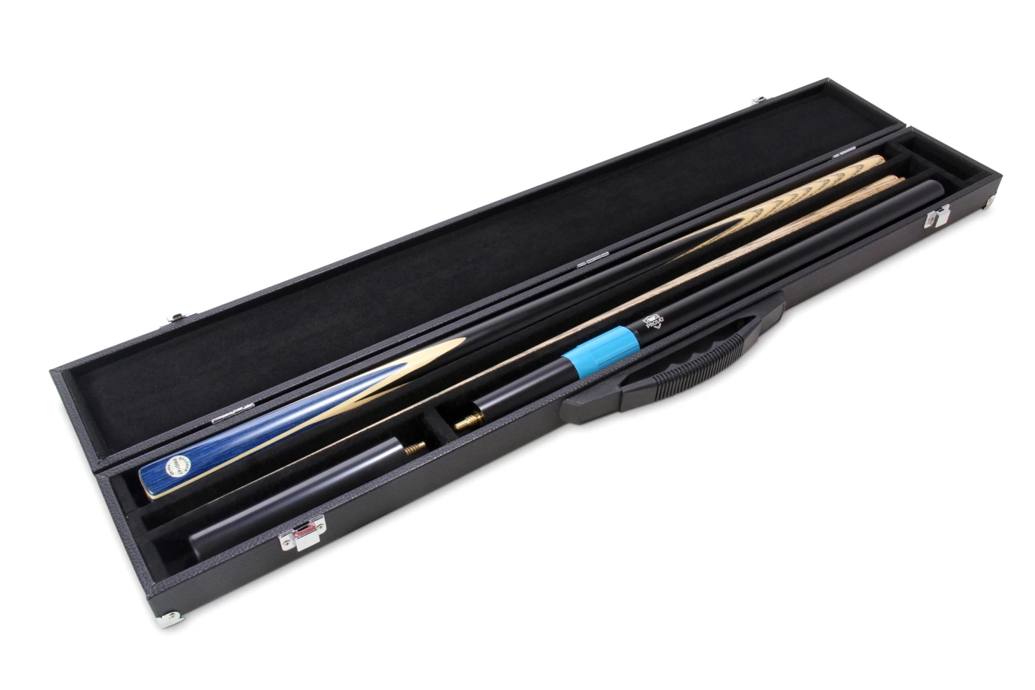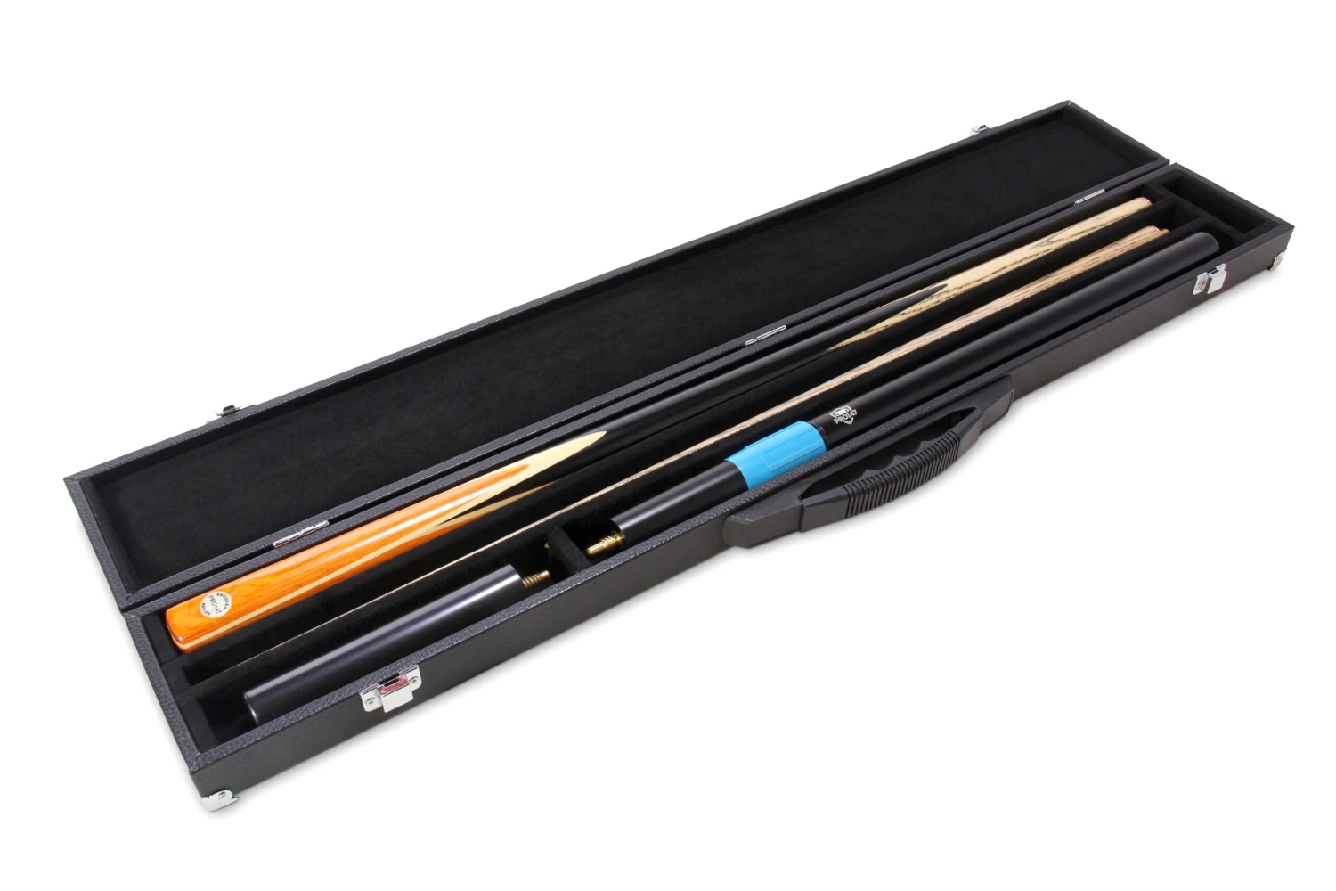 - 3 slot hard case with dedicated compartments for mini butt, long extension, cue and chalk