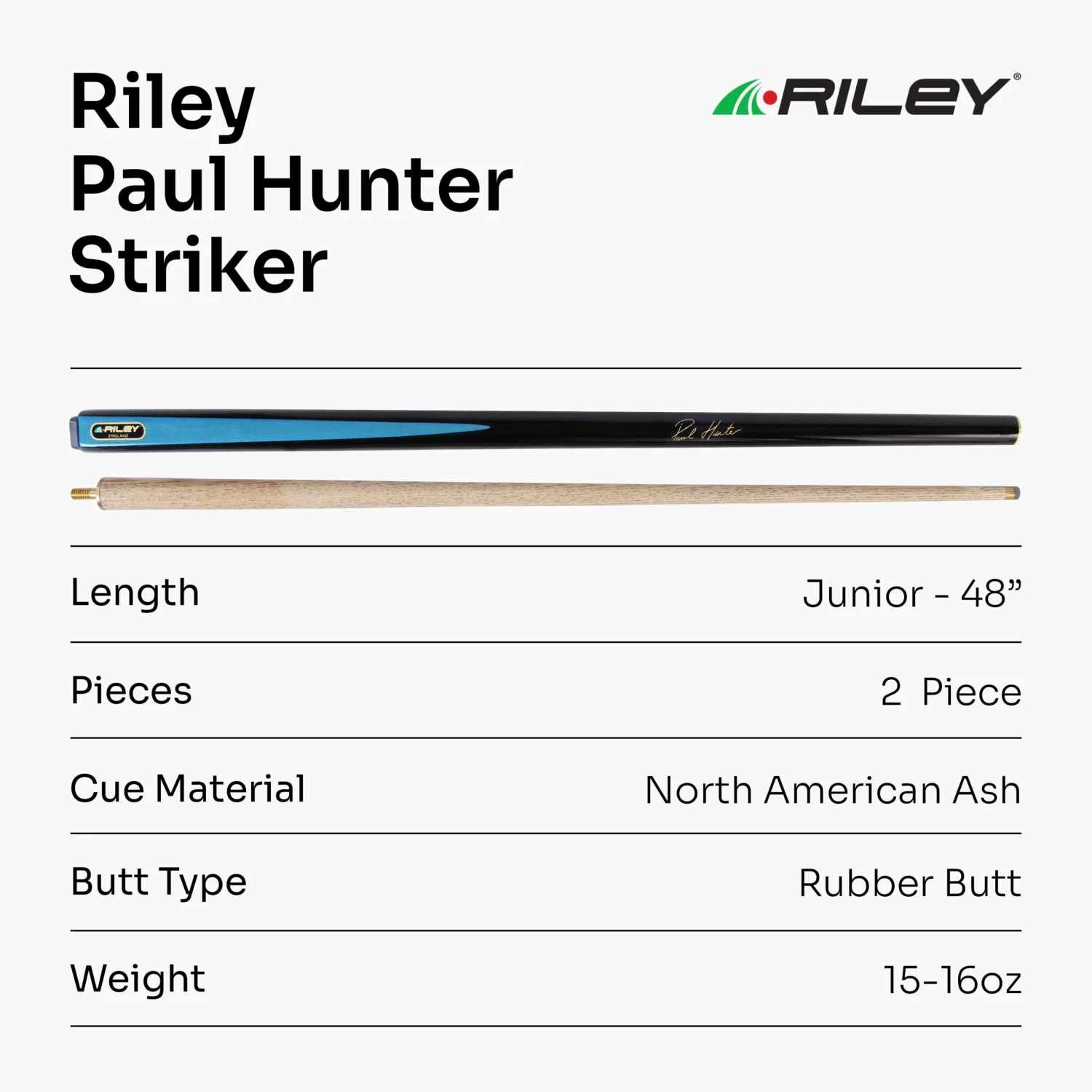 The Riley Paul Hunter Striker 48 inch cue is ideal for home tables, kids or anyone who prefers a shorter cue. It has a Paul Hunter signature graphic on the butt of the cue with an attractive blue stripe design. With a 9.5mm leather tip, this cue is suitable for use in both snooker and English pool.