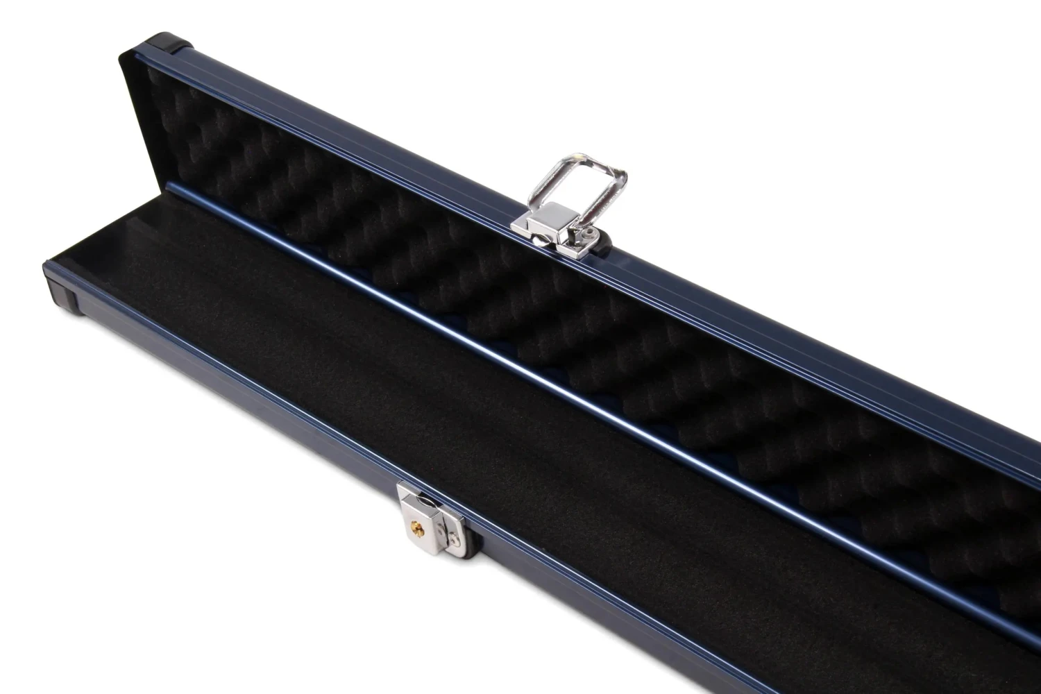 The ‘ALUMINIUM PRO LOCK’ range are excellent value aluminium cue cases with lockable chrome latches and toughened ABS plastic ends for superior protection. Its foam lined interior holds the cue tight and secure and an internal divider keeps the shaft and butt separate and protected. It has a strong retractable handle for convenience in carrying and a separate internal chalk compartment. This case will hold one ¾ joint cue, a long telescopic extension and a 6 inch mini butt.